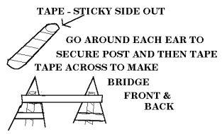 aerated tape as shown.Then tape a bridge between the ears with 3/4" 3M filament tape to hold them up, being careful they are in a natural position. You can keep the ears taped for a week, but then even if they haven't come loose, you must remove them and make sure the pups ears are dry and clean. Whether they are up or not, leave them alone for a day or two. Retape them if they fall again. Smell the ear and if there is an odor, you may want to ask your veterinarian for some Tresaderm. An odor could mean an ear infection and if the ear is odorous or looks swollen, don't re-tape until you've corrected the situation or seen a Vet.